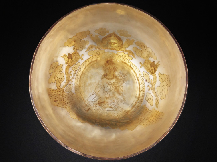 Внутри каждой чаши нанесена чеканка - изображение в духе тибетского буддизма, неварская традиция: Будды, Белая Тара, Зелёная Тара, Манджушри, Ченрезиг, Дзамбала.
